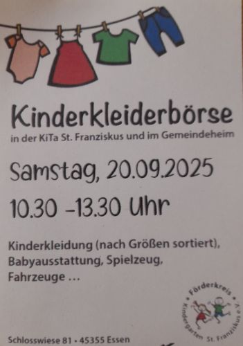 Am 16. März 2024 lädt der Förderverein der KiTa St. Franziskus wieder zur beliebten Kinderkleiderbörse ein!